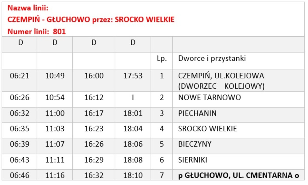 Linia 801 relacji Czempiń - Głuchowo przez Nowe Tarnowo, Piechanin, Srocko Wielkie, Bieczyny, Sierniki