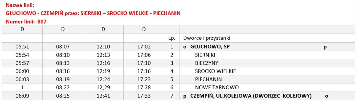 Linia 807 relacji Głuchowo - Czempiń przez Sierniki, Bieczyny, Srocko Wielkie, Piechanin, Nowe Tarnowo