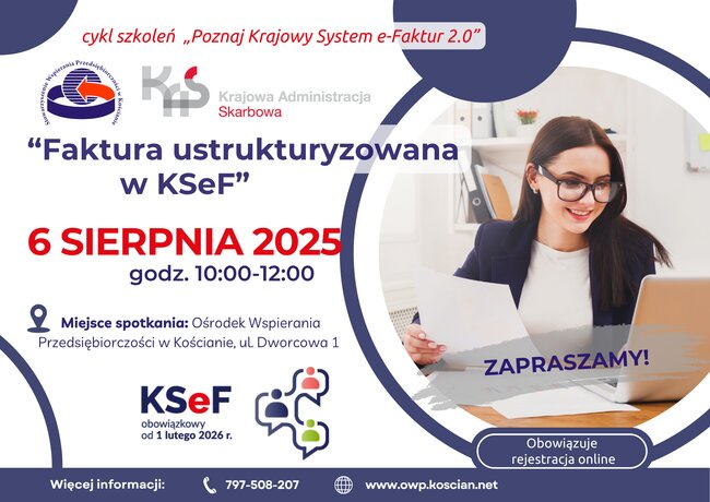 Naczelnik Urzędu Skarbowego w Kościanie we współpracy ze Stowarzyszeniem Wspierania Przedsiębiorczości w Kościanie zaprasza na cykl szkoleń pt. „Poznaj Krajowy System e-Faktur 2.0”.