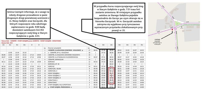 Z uwagi na prowadzone prace drogowe w pasie drogowym drogi powiatowej nr 3916P realizowane w miejscowości Gorzyczki, Nowy Gołębin oraz Donatowo w dniu 1 września 2025 r. (dzień rozpoczęcia roku szkolnego) na linii nr 812 zostaną wprowadzone zmiany w rozkładzie jazdy transportu publicznego.