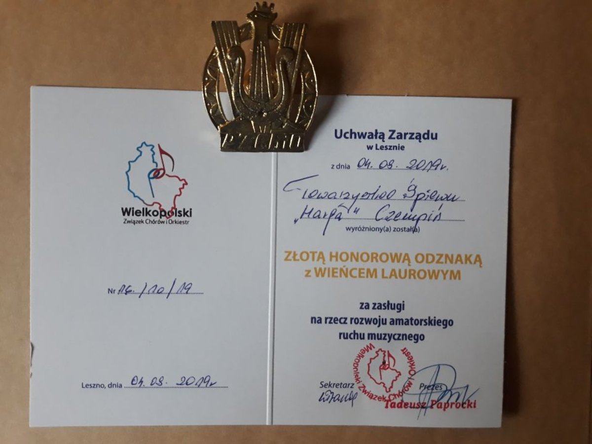 2019 r. - odznaczona Złotą Odznaką Harfy