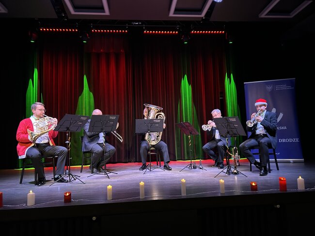 Kwintet dęty w składzie: 2 trąbki, waltornia, puzon i tuba zabrał nas w magiczną, bożonarodzeniową podróż. W sali wybrzmiały najpiękniejsze polskie kolędy oraz świąteczne melodie z całego świata – od motywów z „Dziadka do orzechów” Piotra Czajkowskiego, przez „We Wish You a Merry Christmas”, aż po energetyczne „Carol of the Bells”.