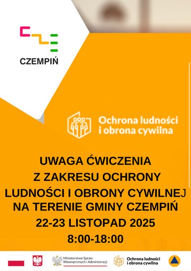 Na podstawie § 7 Rozporządzenia Ministra Spraw Wewnętrznych i Administracji z dnia 25 lutego 2025 r. w sprawie ćwiczeń z zakresu ochrony ludności i obrony cywilnej (Dz. U. poz. 253) informujemy, że w dniach 22-23.11.2025 r., w godzinach 09.00-18.00, na terenie Gminy Czempiń, zostaną przeprowadzone ćwiczenia praktyczne z zakresu ochrony ludności i obrony cywilnej oraz zarządzania kryzysowego.
