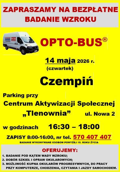 Już 14 maja 2026 r. (czwartek) do Czempinia przyjedzie OPTO-BUS, w którym będzie można wykonać darmowe badanie wzroku.